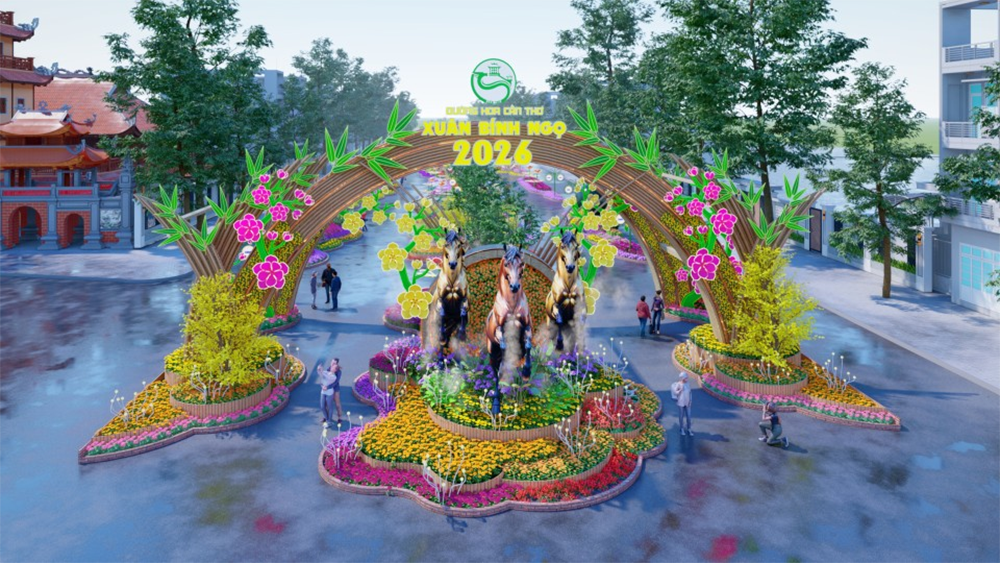 Đường hoa Tết Bính Ngọ 2026 ở trung tâm Cần Thơ dài 310 m, mang chủ đề “Tết sum vầy”, thể hiện khát vọng vươn lên sau sáp nhập với Hậu Giang, Sóc Trăng.